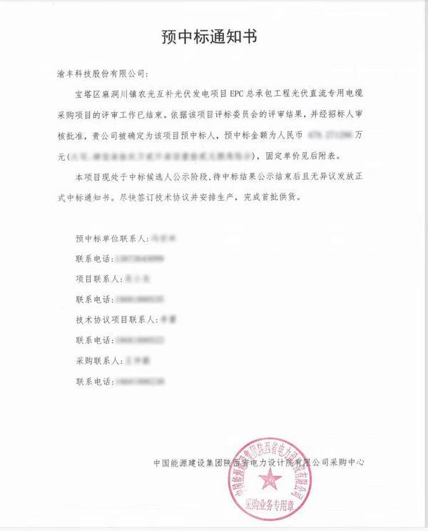 近日,渝丰科技销售团队传来喜讯,我司被确定为宝塔区麻洞川镇农光互补光伏发电项目EPC总承包工程光伏直流专用电缆采购项目的预供应单位。