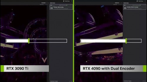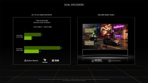 GeForce RTX 40 系列还配备新款 AV1 双编码器。双路编码器可以协同工作,并在二者之间自动分配工作以实现双重输出,至高可将导出时间缩短 50%。与普通用户相比,GeForce RTX 40 系列显卡用户可获得即时优势,以多种格式将视频快速导出至不同平台。