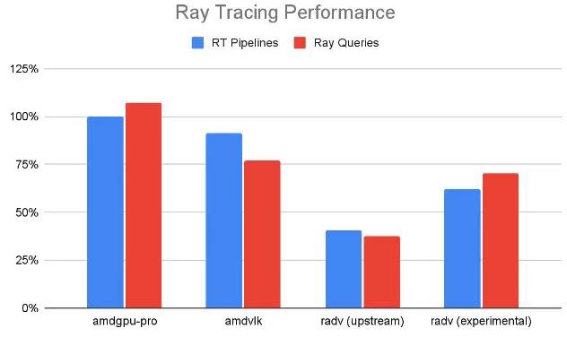 与 RADV 相关的另一个主题是 AMDVLK 光线跟踪支持的性能对比,以及 AMDGPU-PRO 专有驱动程序的性能对比。RADV 在使用光线追踪时仍然表现一般,但开发人员正在使用实验性技术来提高性能。
