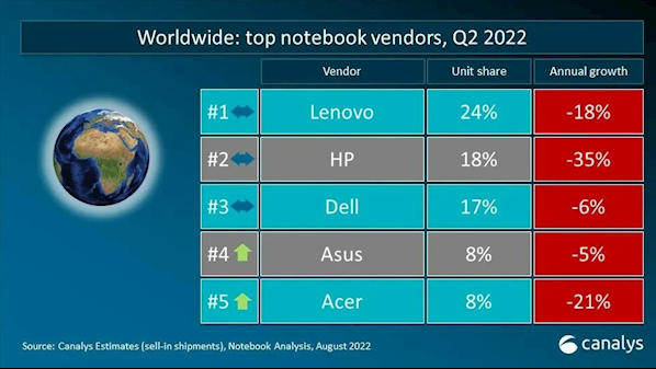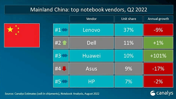 市场调研机构Canalys发布了2022年第二季度中国笔记本市场市占率的最新报告,根据报告显示,在国内市场占比率最高的前五笔记本厂商排名分别是:联想(37%)、戴尔(11%)、华为(10%)、华硕(9%)、惠普(7%)。