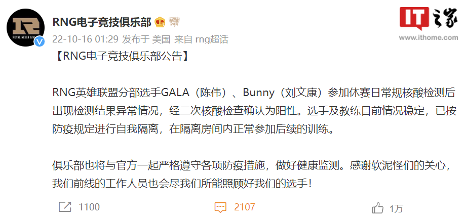 今日凌晨,RNG 电子竞技俱乐部发布公告称,RNG 英雄联盟分部选手 GALA(陈伟)、Bunny(刘文康)参加休赛日常规核酸检测后出现检测结果异常情况,经二次核酸检查确认为阳性。选手及教练目前情况稳定,已按防疫规定进行自我隔离,在隔离房间内正常参加后续的训练。