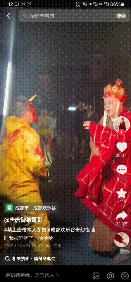新抖数据显示,10月29日至11月3日,在万圣节前后的5天里,“唐僧”相关内容日均获赞超112万,其中多条视频的主人公是田向阳扮演的唐僧,10月31日由网友“裕裕麻麻”拍摄的一条视频获赞达88万。