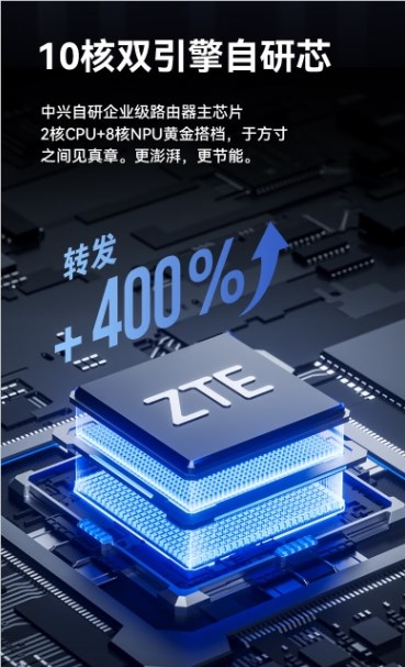 中兴巡天BE5100路由器搭载了中兴10核双引擎自研芯与6nm WIFI芯片,实现了转发超400%的提升。作为行业在WIFI芯片领域的最 高制程,它有效降低了能耗,延长了使用寿命,同时还保证了路由器更稳定的性能,让用户在使用的过程中能始终流畅如一。