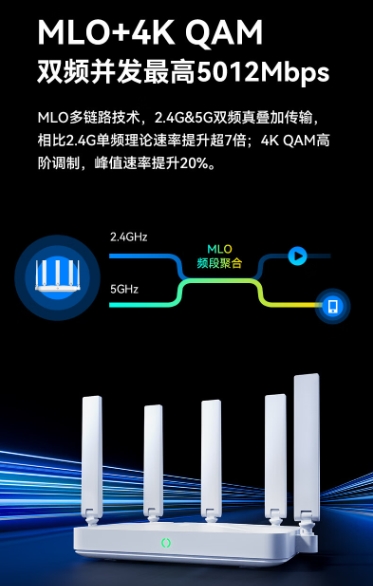 中兴巡天BE5100路由器支持的4KQAM+MLO可大幅提升网络性能,降低时延。MLO多链路技术能满足2.4GHz和5GHz两个频段同时传输数据,这种双频真叠加传输比起2.4G单频的速率要提升超7倍;4K QAM的高阶调制也让终端设备的上网峰值速率提高了20%。不管是在看4K大片还是传输大数据包,都能畅享网速自由。