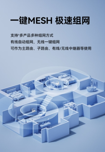 除了满血的硬核配置,中兴巡天BE5100还提供了强大的Mesh组网功能。用户可以根据户型、多端智能家居设备,进行多种组网方式连接,满足全屋网络覆盖的需求。而且组网方式非常简单,几乎可以说是即插即用,一键即可完成以往复杂的操作,帮助用户实现信号的广泛传播和稳定连接。
