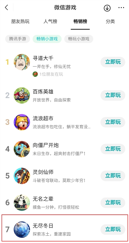 《无尽冬日》进入微信小游戏安卓畅销榜TOP7