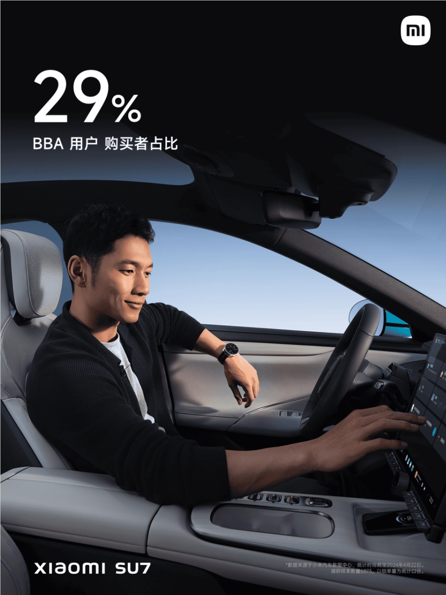 据了解,小米SU7 一经发布,即实现了全面“破圈”。在锁单用户中,女性直接购买者占比达 28%,根据初步调研,考虑到赠送或为家人购买等情况,预计女性车主占比将达 40%-50%。此外,被先进智能科技和驾驶质感所打动,小米 SU7 的锁单用户中BBA用户占比29%。支持无线CarPlay、支持iPad 上车,也让小米SU7 成为很多苹果用户购车首选,苹果用户占比高达51.9%,根据调研,很多苹果手机用户同时也是米家产品的用户。