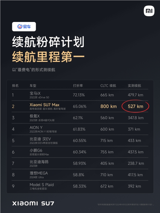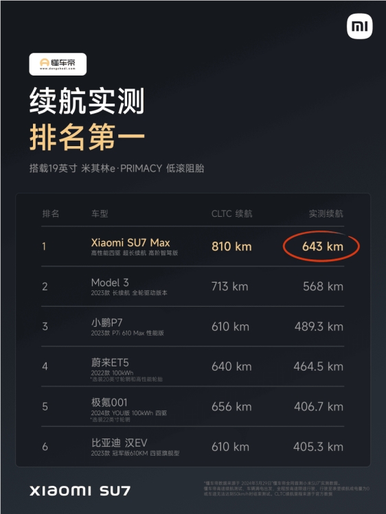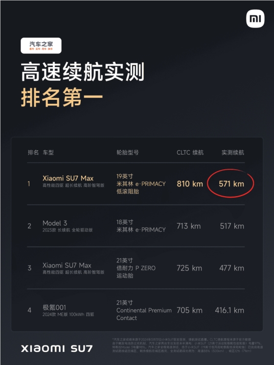 根据懂车帝、汽车之家、易车网等三家专业汽车垂直媒体的续航测试,小米SU7 在各榜单所有车型的实测续航里程均排名第一。在专业汽车媒体新出行的高速 NOA横评中,小米SU7 实现全程零接管,媲美小鹏和华为,达到行业领先水平。