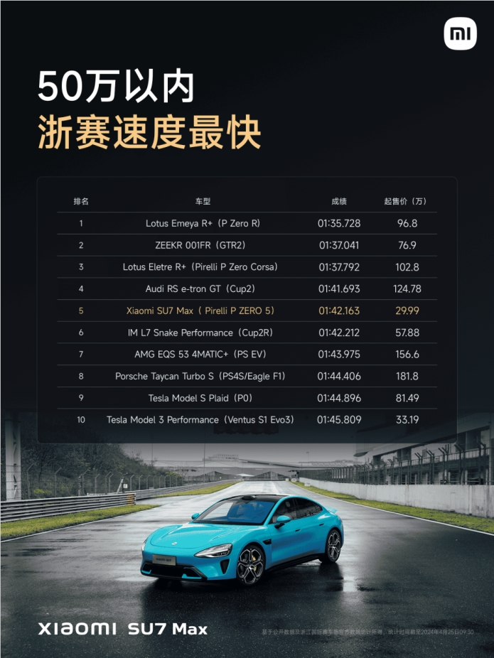 此外,小米 SU7 Max 还正式登录国内含金量最高的浙赛《赛道圈速榜》,圈速成绩 1 分 42 秒163,超越 Taycan turbo S和 Model S Plaid,成为浙赛 50 万以内速度最快的电动车。为探究 SU7 Max的极限性能,在搭载小米在研的包含米其林 PILOT SPORT CUP 2R 半热熔轮胎的高性能套装后, SU7 Max的圈速成绩达到1 分 38 秒043,媲美 Lotus Eletre R+等百万豪车性能。