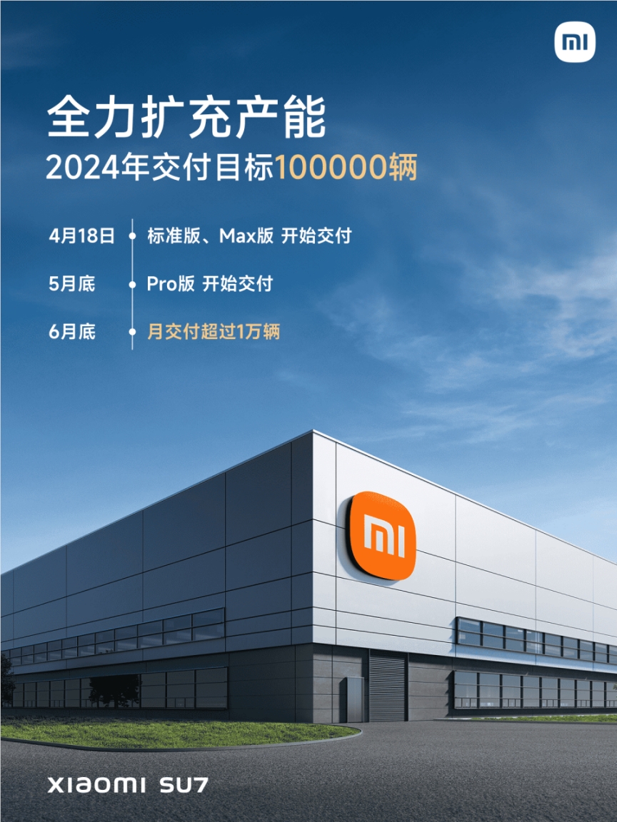 据悉, 2024 年小米SU7 在交付、服务和 OTA 上将全面加速。原计划 4 月底交付的标准版和Max版已经提前到了 4 月 18 日, 5 月底将交付Pro版, 6 月预计交付将突破 1 万台。2024 年小米SU7 的全年交付目标已提升为 10 万台。