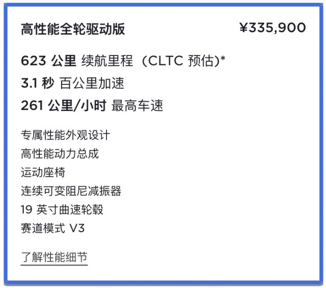 根据官网介绍,新款Model3高性能全轮驱动版拥有623公里续航里程 (CLTC 预估)、3.1秒百公里加速、261公里 / 小时最高车速、专属性能外观设计、高性能动力总成、运动座椅、连续可变阻尼减振器、19英寸曲速轮毂、赛道模式V3。
