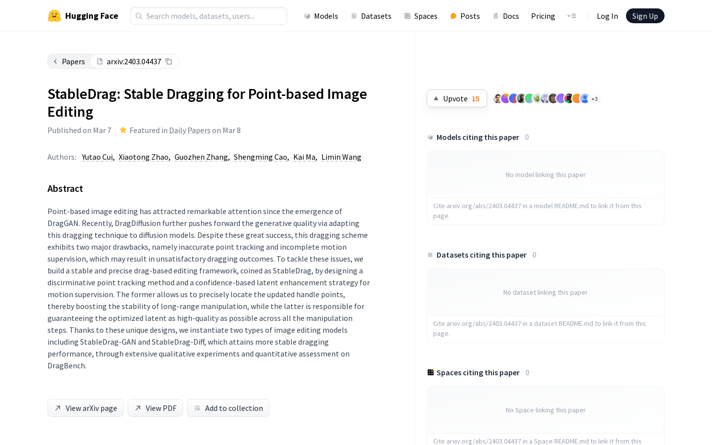 StableDrag是一种基于点的图像编辑框架,专门解决现有拖拽方法存在的不准确点跟踪和运动监督不完整的问题。该工具设计了一种判别式点跟踪方法和基于置信度的潜在增强策略,以提高长距离操作的稳定性,并确保编辑过程中优化的潜在表示质量。经过广泛的定性实验和DragBench上的定量评估,StableDrag能够为用户提供更稳定的拖拽性能。