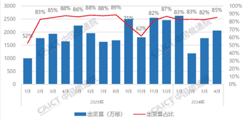 中国信息通信研究院近日发布了2024年4月国内手机市场的运行分析报告。报告显示,4月份国内品牌手机出货量达到2057.6万部,同比增长了25.5%,占同期手机总出货量的85.5%。相比前三个月,国产手机出货量占比逐渐上升,在3月份为83%,4月份达到85.5%,成为本年度最高值。