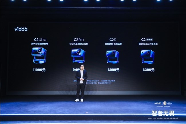其中,跨代引领画质巅 峰C2Ultra和同代机皇C2Pro配备了行业首创的0.9~1.5:1超广投射比超 级光学变焦镜头,实测亮度高达3000流明和2600流明,画面对比度达2000:1,首发价格分别为11999元和9499元;全能旗舰C2S和质价比之 王C2好版同样带来了2000流明和1700流明的同价位超高实测亮度,画面对比度达1700:1,首发价格分别为6999元和6399元。Vidda C2Ultra、C2Pro和C2S都载了全球顶 级音响品牌JBL定制的10W×2高保真音响,使其不仅拥有行业顶 级的画质,还拥有了世界 级的音响表现。
