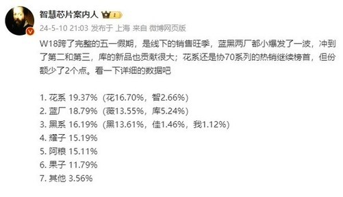 不过,在线下的销售旺季W18期间,vivo和OPPO两大厂都小爆发了一波,冲到了第二和第三的位置。iQOO的新品也对销量做出了很大贡献。华为方面,Pura 70系列持续热销,助力华为继续保持榜首位置。但与上周相比,华为的份额少了2个百分点。
