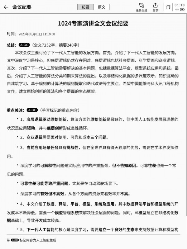 其中,最让我感兴趣的,还是星火大模型在科大讯飞智能办公本X2 上的应用升级。据悉,作为行业中第 一个吃螃蟹的人,基于讯飞星火认知大模型,讯飞智能办公本X2 进行了 2 大功能更新,发布了最 新固件。新版本结合星火认知大模型的先进技术,在笔记的记录模块中新增了【AI助手】按钮,在原本自动记录会议内容的基础上,实现了会议内容“语篇规整”和生成“会议纪要”两大功能的跃升。