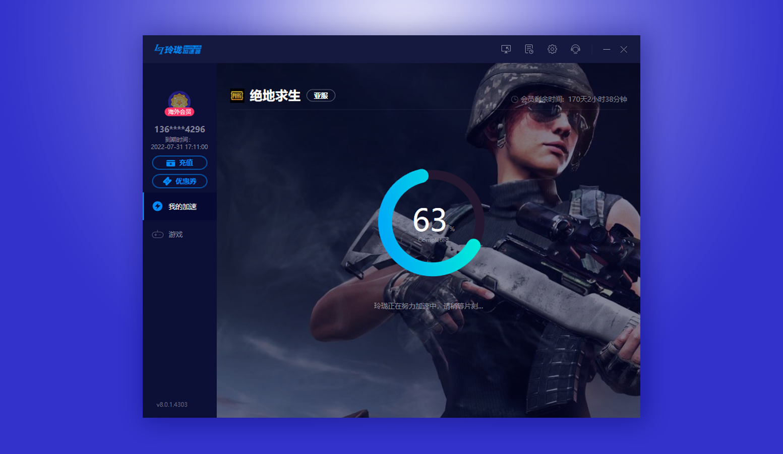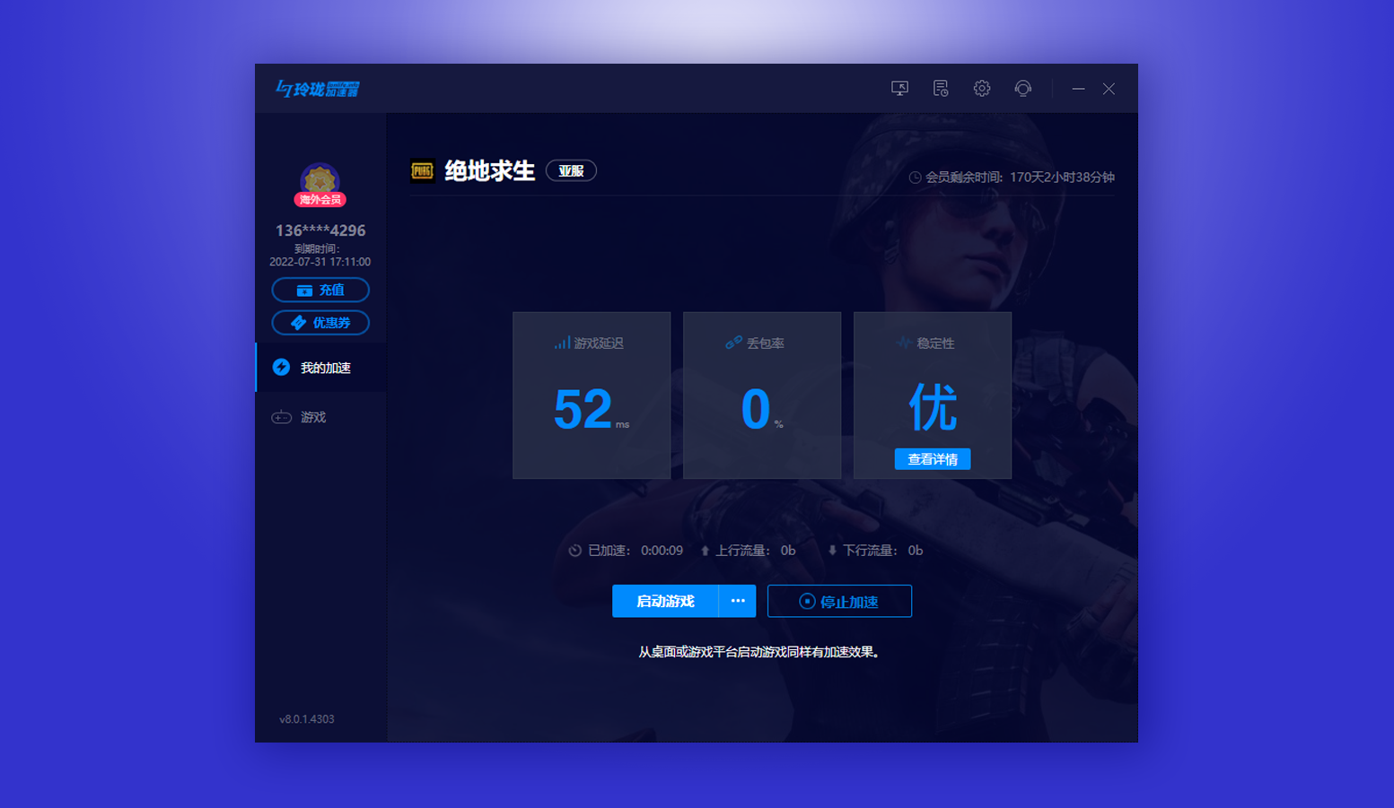 ● 全平台支持,一号通用所有端,支持上千款游戏。 ● 操作简单,一键智能加速,自动匹配最优节点。 ● 国内多线,全球专线加速,超低延迟、零丢包、不掉线。 ● 保障流畅游戏体验,超长试用时间,热门游戏周免。