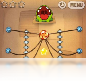 这是一款触屏操作的游戏,玩家需要根据不同的情况去切断糖果的绳子、点破气泡或者按触吹气装置等,不同的操作将体验到不同的结果,当然随意的切断绳子并不会让糖果掉到小东西的嘴里,你需要瞬间判断角度和抛物线。